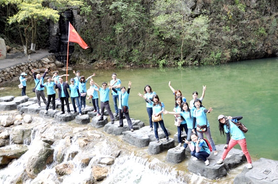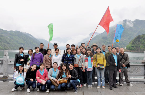 第二天游览的是土家族的母亲河——清江画廊。洋洋洒洒八百里的清江宛如一条蓝色漂带,穿山越峡,齐跃山逶逶西来,横贯鄂西南10多县市,随着隔河岩、高坝洲、水布垭水利枢纽工程的兴建,在清江流域内形成386万亩的亦江亦湖的奇妙自然景观,两岸独特的喀斯特地貌,峰峦叠峰,直刺苍穹,湖内数百翡翠般的岛屿星罗棋布、灿若绿珠。如黛江水烟波浩渺,高峡绿林曲径通幽,人称清江有长江三峡之雄,桂林漓江之清,杭州西湖之秀,风光无限,无与伦比。清江的山,清江的水,清江的人,清江的民族………融汇在一起的是一江生生不息,浩浩荡荡, 博大精深的文化,如诗,如画,如梦,如歌。倘佯期间,足以使人惊愕 、亢奋、醉然。