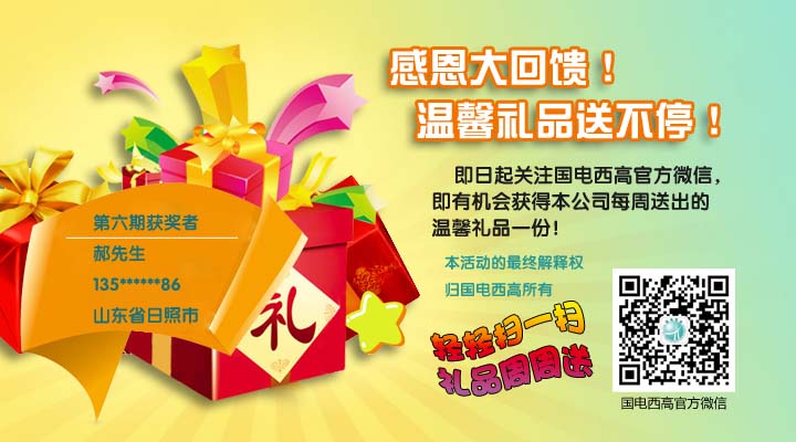 扫微信赢奖品的活动自11月11日起,第六期获奖者是山东省日照市的郝先生,奖品是一个ZIPPO打火机,奖品已寄出,请郝先生注意查收,优速快递单号:6681 4168 9054。 每一期的奖品随机送出,第七期的神秘大奖获得者会是谁呢?请拿起您手中的手机扫描国电西高二维码或搜索国电西高微信名,即有机会成为那个幸运者。本次活动共10期,10期抽奖活动做完请期待下次的活动。本活动最终解释权归国电西高所有。 奖品:ZIPPO打火机
