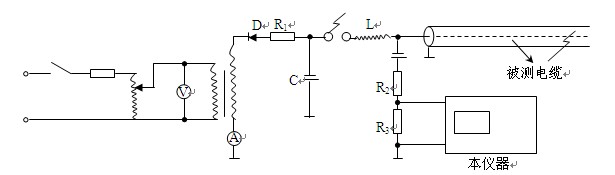 3.按图所示线路连接设备。地线按要求接好。其中储能电容C要求大于1μF,耐压应能满足试验要求。其它设备要求与直闪法相同。电感一般取27001中的2或3,也可视被测电缆段的长度或根据反射波形适当增大或减小。
